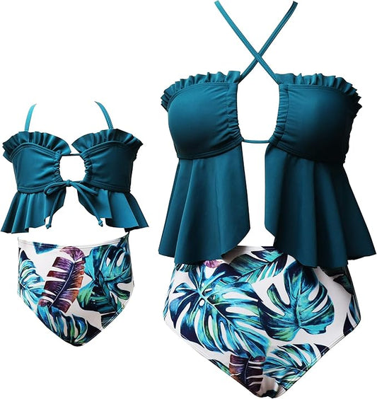 Mommy and Me 2 Piece Bikini Green Floral Swimsuit