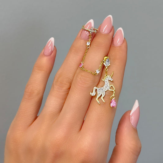 Crystal Unicorn Chain Earring with Cuff – Gold & Pink Gem Accents