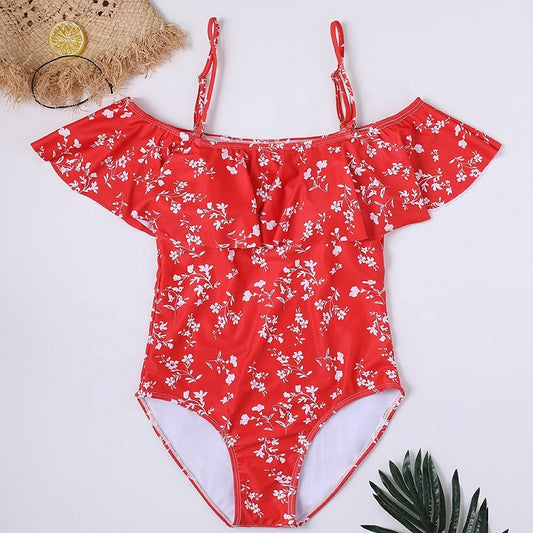 VINTAGE OFF SHOULDER RUFFLED RED FLORAL SWIMSUIT