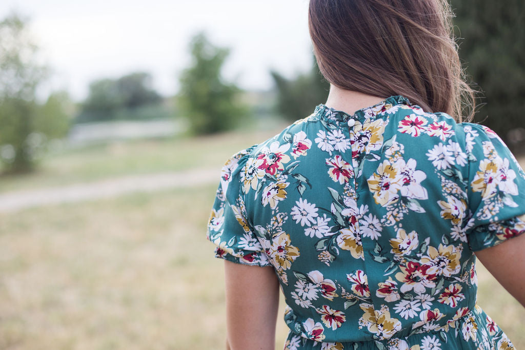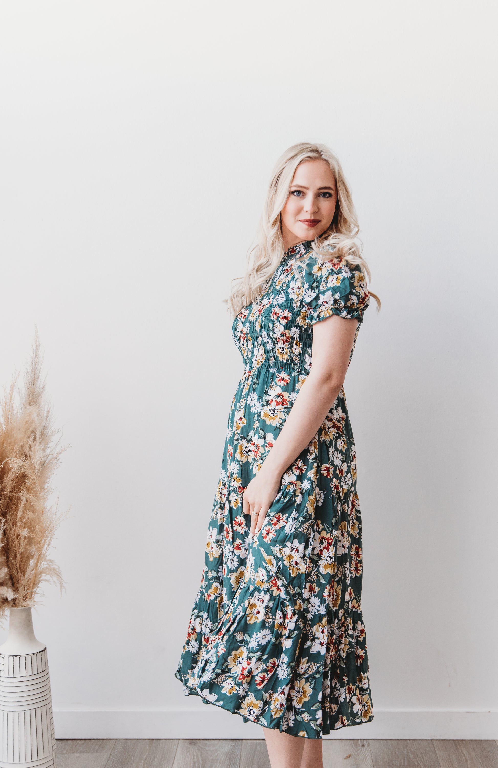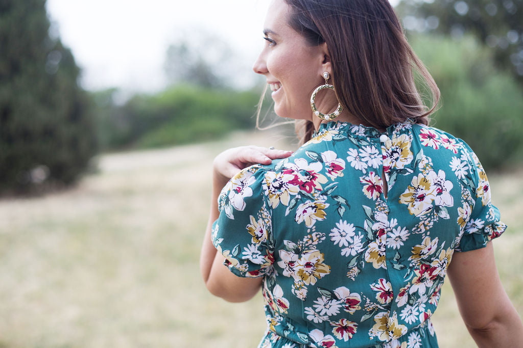 Add a floral punch to your wardrobe with this gorgeous midi dress. Featuring a ruffled mock neck, a breath-taking shirred bodice, and a flowy tiered skirt, this dress is perfect for creating a standout look. The puffy sleeves add a touch of volume and style, while the comfortable smocked bodice ensures a flattering fit.